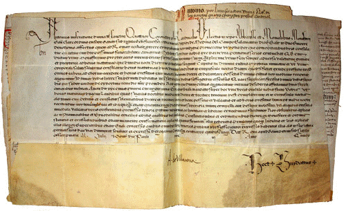 | Sello de Gonzalo de Vivero, obispo de Salamanca, en un traslado de una bula de Pablo II (1464-1471) para que todos los monasterios de la Diócesis perciban los diezmos y rentas que les corresponden por sus posesiones. Salamanca, 26 septiembre 1468 | | Sello real de los Reyes Católicos Pende de un privilegio de los Reyes Católicos confirmando un juro de heredad sobre distintas alcabalas de la villa de Medina al Monasterio de Santa Clara. Medina del Campo, 6 septiembre 1497 |