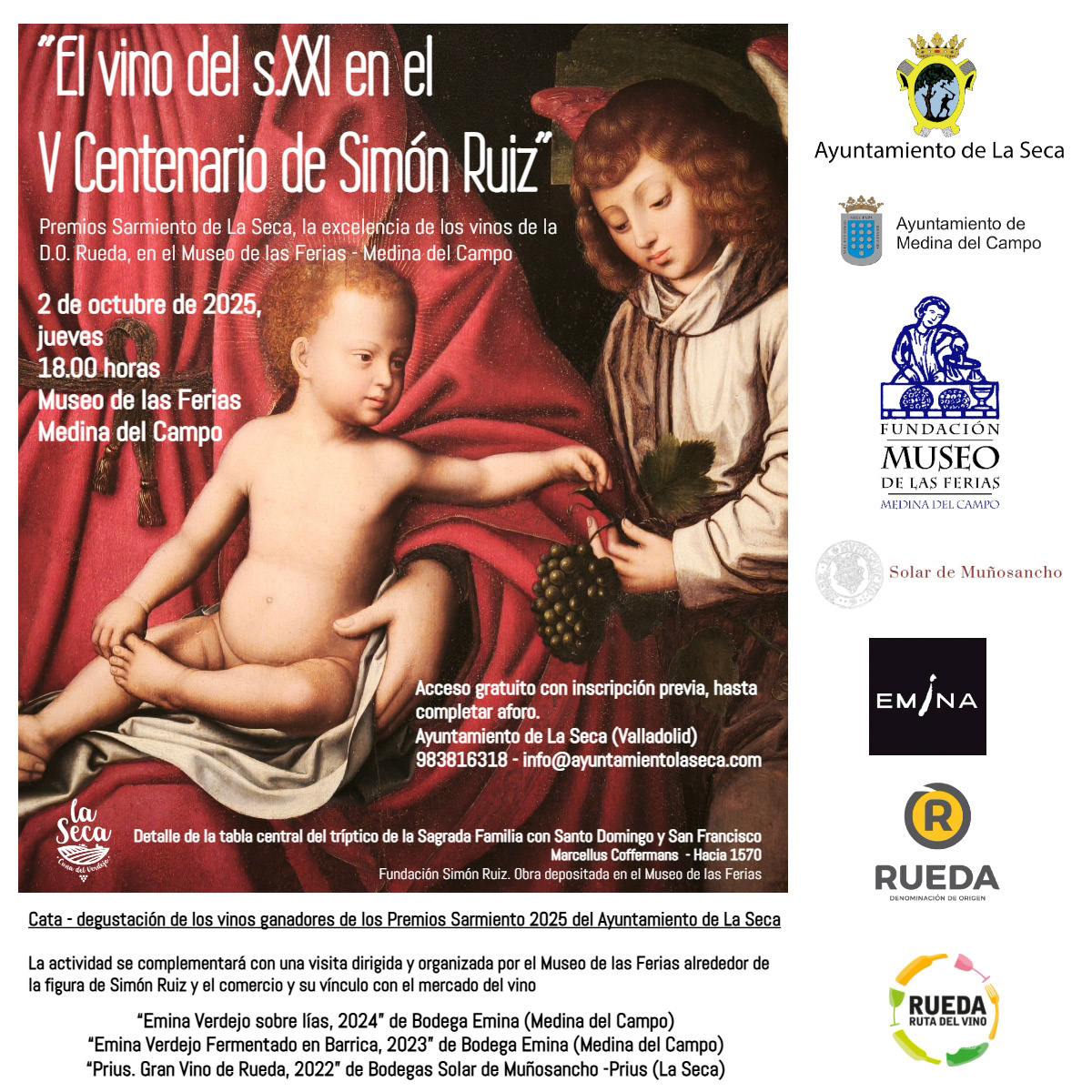 El próximo jueves 2 de octubre, a las 18 h., tendrá lugar en el Museo de las Ferias una “Cata-degustación de los vinos ganadores de los Premios Sarmiento 2025”, auspiciados por el Ayuntamiento de La Seca, que será precedida por una visita breve al museo con atención especial a las obras artísticas que presentan referencias al mundo de la uva y el vino. También se presentará la exposición documental “El vino de la Tierra de Medina en la época de Simón Ruiz” en la que se mostrarán documentos originales del siglo XVI relacionados con la historia del vino y su compraventa, antiguas ordenanzas, cultivo y cuidado de las viñas, etc. Acceso gratuito con inscripción previa, hasta completar el aforo.