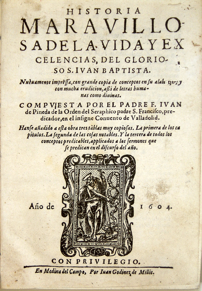 El 8 de diciembre de 1585 se concedía a fray Juan de Pineda prórroga para la edición de sus libros Monarchía Eclesiástica o Historia Universal del Mundo y Vida y excelencias maravillosas del glorioso San Juan Baptista, impreso en 1604, en Medina del Campo, por Godínez de Millis. En esta edición Juan Godínez de Millis, utilizó en la portada uno de los escudos tipográficos más pequeños empleados por el impresor salmantino Juan Moreno, la figura de San Juan Bautista con el Agnus Dei, bien porque se adecuaba al título del libro o porque las iniciales I.M. que aparecen al pie se acomodaban a su nombre y apellido, Juan de Millis Godínez, pues de las dos maneras aparece mencionado este impresor.