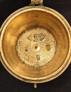 La tapa del vaso guardador no presenta marca de país de destino, aunque las marcas de contraste señalan a España inequívocamente a pesar de no llevar el símbolo “S” (Spanien) en su superficie.