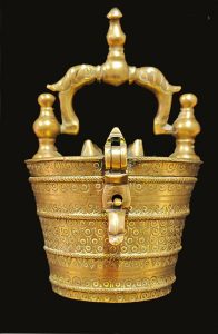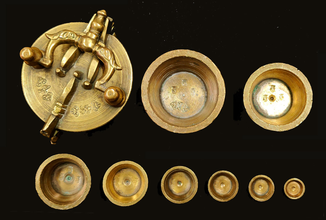 Conserva nueve 9 vasos: 2 libras 914’7 g; 1 libra 459’6 g; ½ libra [1 marco] 229’4 g; 4 onzas 114’8 g; 2 onzas [16 ochavas] 57’3 g; 1 onza 28’6 g; ½ onza 14’2 g; 2 ochavas 7’2 g; 1 ochava 3’6 g [falta un vaso macizo de ½ ochava, 1’8 g]