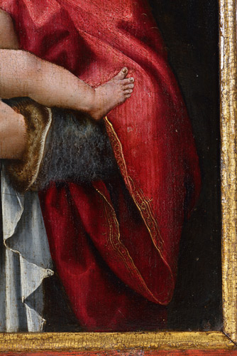 Otro aspecto a destacar es que el fondo negro es un repinte realizado con betún, penetrando en la pintura subyacente de color azul a base de albayalde y azurita. El repinte se debió aplicar por cuestiones estéticas puesto que los cristales del pigmento no están alterados, como se puede observar sobre todo bajo condiciones de fluorescencia. El repinte penetra en la capa pictórica original, por la semejanza de medio aglutinante entre ambas. El marco está repintado. El dorado actual se superpone al dorado original y la policromía roja a un estofado en oro y negro (fotos 1 y 2).